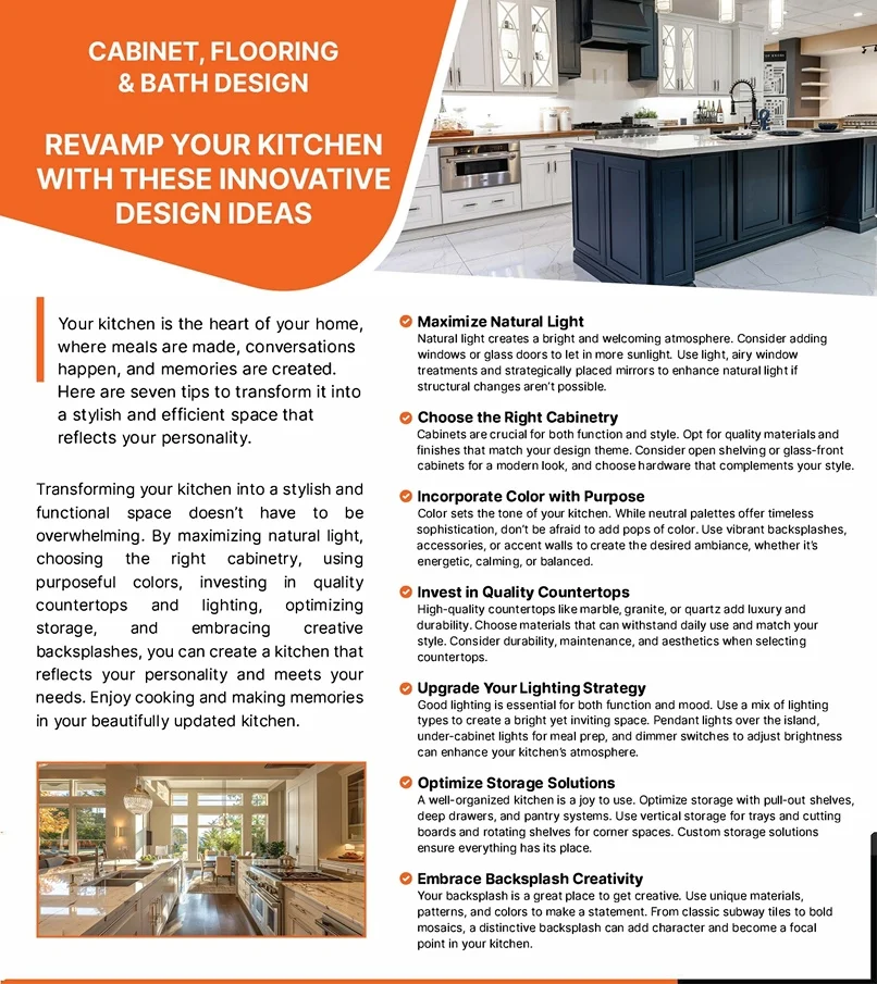 Check out our flyer below for innovative tips on how to approach your kitchen remodel—from maximizing storage to embracing backsplash creativity.